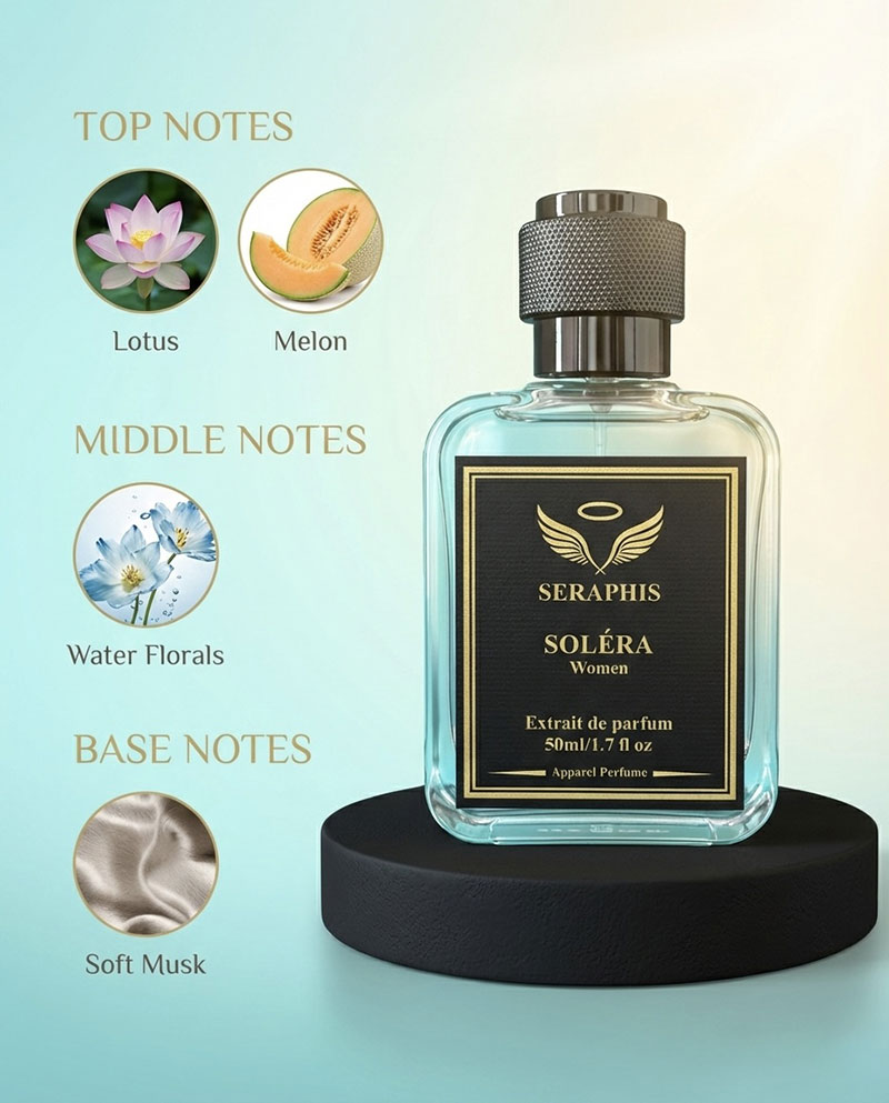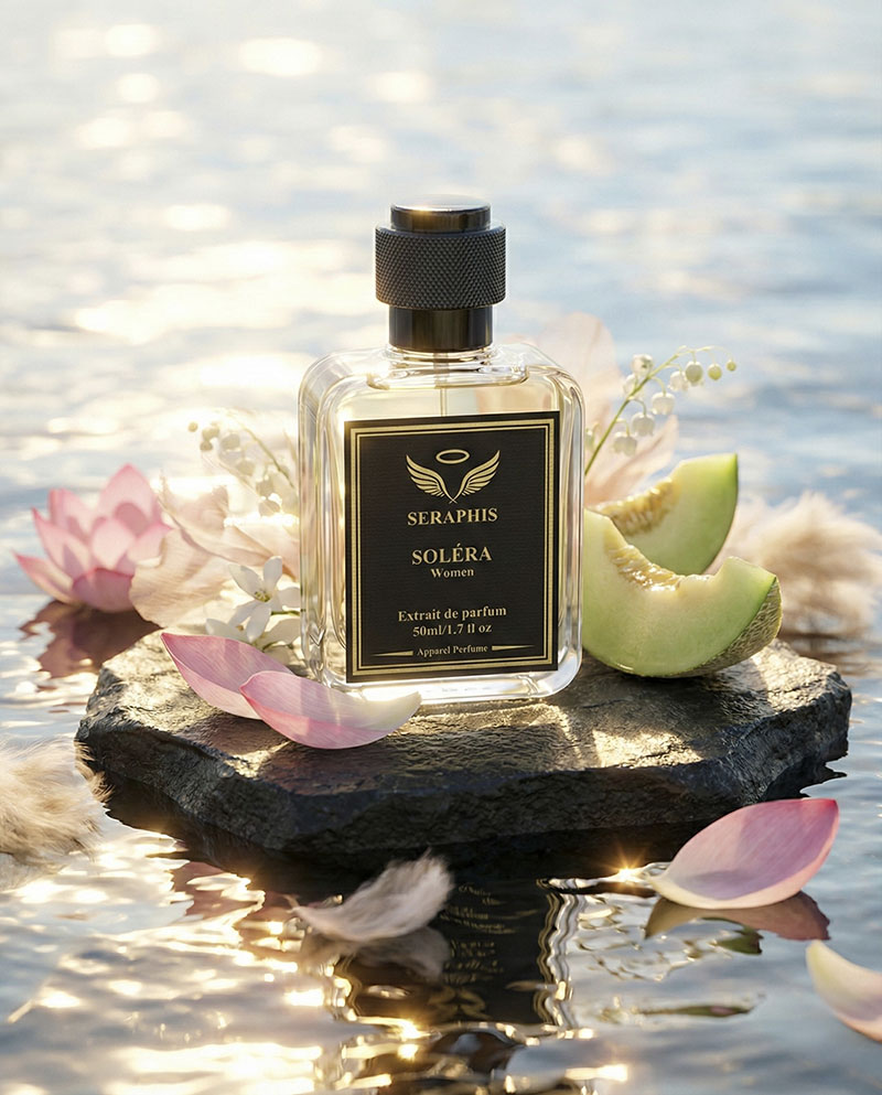 SOLÉRA by Seraphis captures the feeling of sunlight reflecting on water — calm, radiant, and quietly uplifting. This luminous fragrance opens with refreshing melon and lotus, bringing a gentle aquatic freshness that feels effortlessly elegant.