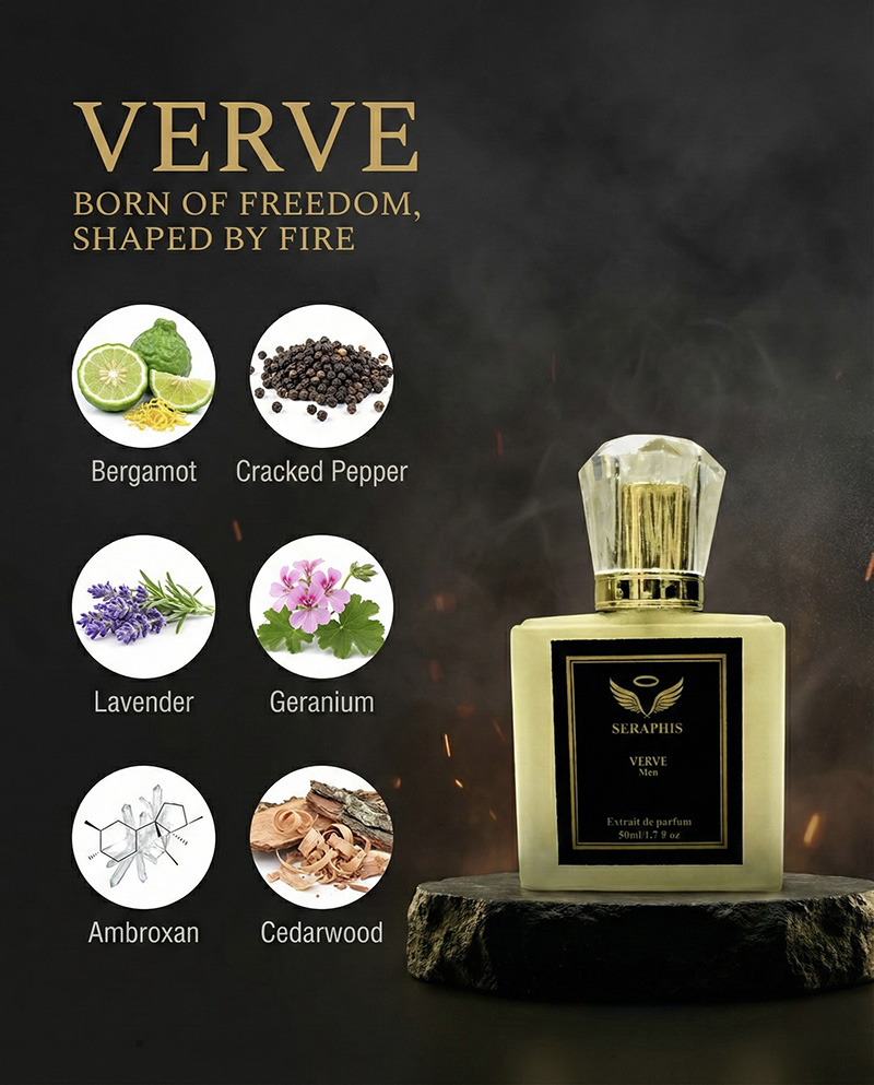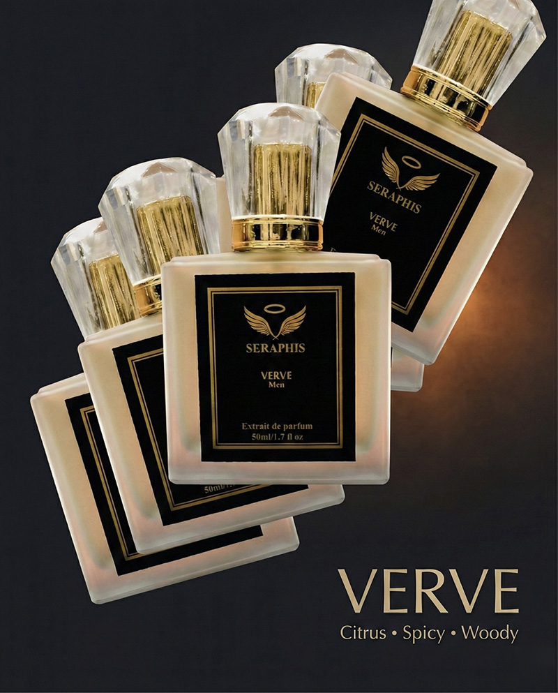 VERVE by Seraphis is a fragrance that captures energy, freedom, and effortless confidence. The scent opens with bright citrus notes that feel vibrant and uplifting, creating an immediate impression of freshness and vitality.